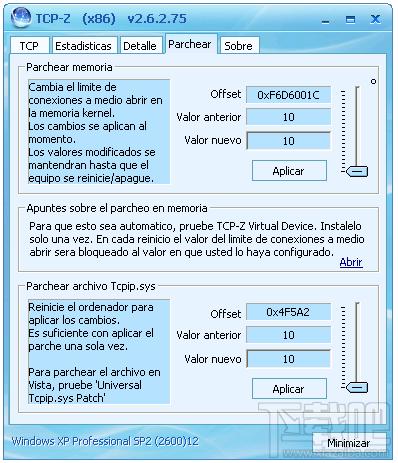 TCP-Z是一个功能强大的TCP半开连接数和谐全能完美补丁(修改内存方式,支持XPSP2SP3/VistaSP1SP2/Windows7,32/64位)。和谐TCP/IP连接数限制,释放网络潜能,下载更快,浏览更流畅。图表显示网络连接数据,分析下载速度的好帮手。