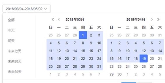 双日历插件daterangepicker是一款双日历选择日期的功能时间段选择控件,将daterangepicker的一个双日期选择格式修改成两个单日期格式的日期选择框,修改了时间格式,设置为中文,提供双日历的选择以及最近7天,30天,60天等便捷选择日期。